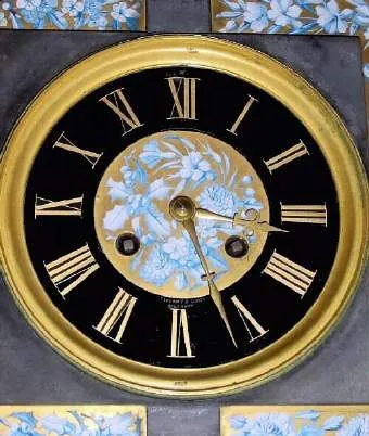 C.1890, French for Tiffany and Co., New York unusual black slate and porcelain panel mantel clock, signed on movement and above numeral 6 on the dial.