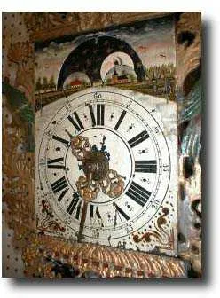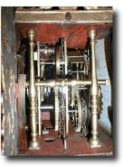 Wood bracket; brass gears; pewter ornamentation; working moon dial in the arch; working calendar window in the lower aspect of the dial; 23" tall. Good condition - restored; clean and reworked gearing in the movement.