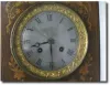 Dutch Marquetry clock, circa 1830's Case: Beautiful inlay, 14" high. Works: Older silk thread suspension 8 day time and strike on bell. Condition: Case: Good, Split in front from natural wood shrinkage; Works: Excellent. Silk thread suspension. Pendulum serial number matches the works.