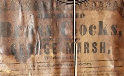 C.1850, George Marsh, Winchester, Conn., 30-hour time and strike OG shelf clock, brass movement.