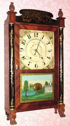 C.1832, M. and E. Blakeslee, Plymouth, Conn., 30-hour time/strike wood movement half column and splat shelf clock /short, with restoration.
