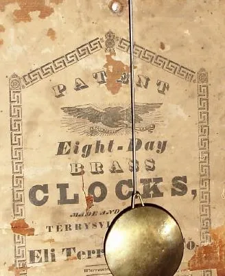 C.1837, Eli Terry, Jr., and Co., Terrysville, Conn., 8-day time and strike brass movement OG shelf clock.