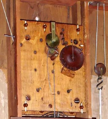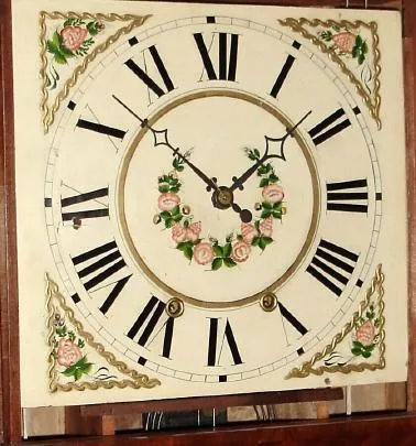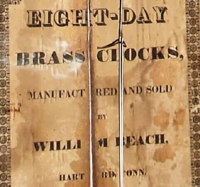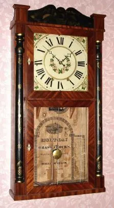 C.1834, William Beach, Hartford, Conn., 8-day time and strike wooden movement, stenciled half column and splat shelf clock.