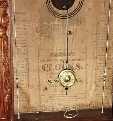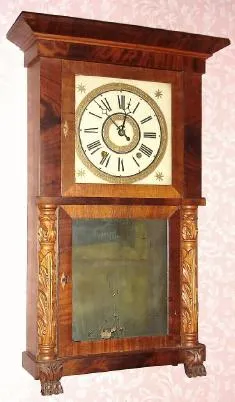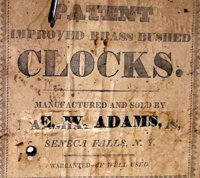 C.1836, E. W. Adams, Seneca Falls, Seneca County, New York, 30-hour time/strike, 2-deck, carved 1/2 column and cornice shelf clock.This is an over-paste on Marshall and Adams label.