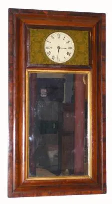 C.1847, George Hills, Plainville, Conn., time and strike reverse ogee mirror clock in a rosewood veneered case.