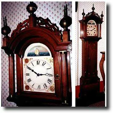 Eastman Clock Co. Longcase "Granddaughter" clock, circa 1930 Walnut case with with eight day movement is powered by a brass weight. ontinuously rocking ship in the arch of the dial; case with inlay banding. 57" tall x 12" wide (at bonnet) Fine condition. Additional keywords: longcase, tallcase, grandfather