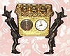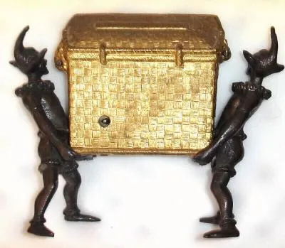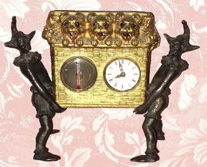 C.1875, German, Mayer, Tongue Animation, 3-Dogs in Basket, held by 2 jesters, one day pendulum novelty.