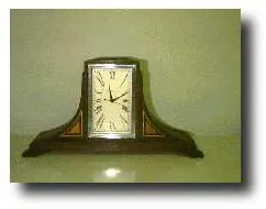 Electric clock, 20th century Case: Wood with inlay 9.5" high, to the outside of the feet 17" long, 5" deep Works:. Reference: Dial and works are marked " Manning Bowman". It was in CN. Condition: Case - good, Works - Electric with original cord -NOT RUNNING.