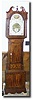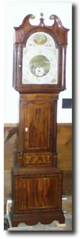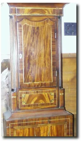 Case: Mahogany veneer with bands of inlay. 86" high. Works: Weight driven with chain 30 hour brass works with bell strike of the hour. Condition: Case; Very good with several well done repairs.; Works; very good, clean and running. The date dial does not operate. Additional keywords: longcase, tallcase, grandfather