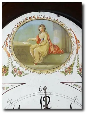 English 30 hour Mahogany Tallcase Clock with painted dial of hunting scene, early 19th century Case: Mahogany veneer with bands of inlay. 86" high. Works: Weight driven with chain 30 hour brass works with bell strike of the hour. Condition: Case; Very good with several well done repairs.; Works; very good, clean and running. The date dial does not operate. Additional keywords: longcase, tallcase, grandfather