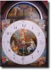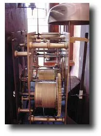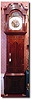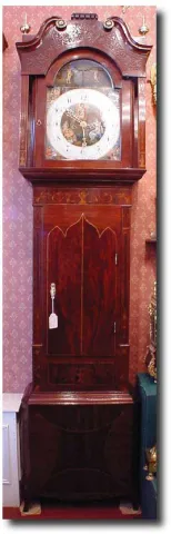 An English automation Adam and Eve mahogany and inlayed longcase clock by "John Alkar", Wigan, the case with swan-neck pediment and outset square section columns, with conforming pilasters flanking the tracery arch top short trunk door on plinth with outswept feet, the 14" painted white dial with painted automata figures of Adam and Eve beside a rocking tree of knowledge to the arch, with spandrels painted with figures of the Evangelists, the white chapter ring signed "John Alkar", Wigan, the centre with allegorical scene of mother with her children flanked by Britannia and watched over by an angel, a ship sinking in the background, the 8-day original automation movement with anchor escapement. 92" x 18" x 10" Additional keywords: longcase, tallcase, grandfather