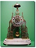 An English cathedral skeleton clock with passing strike by "Smith and Sons" of London. 8-day 5 pillar chain fusee movement with half deadbeat escapement, 6 spoke wheel crossings with a fretted 6 spoke spring barrel exposing the mainspring. Sitting on an original white carera marble base with bun feet (no dome). 24.5" x 15" x 8"