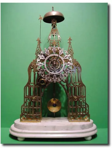 English cathedral skeleton clock, circa 1870. An English cathedral skeleton clock with passing strike by "Smith and Sons" of London. 8-day 5 pillar chain fusee movement with half deadbeat escapement, 6 spoke wheel crossings with a fretted 6 spoke spring barrel exposing the mainspring. Sitting on an original white carera marble base with bun feet (no dome). 24.5" x 15" x 8"