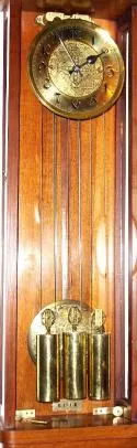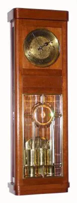 C.1910, German, Gustav Becker, 3-Wt Grand Sonnerie, wall clock in a Deco styled walnut case with a decorative panel with 8 panes of heavy beveled glass.