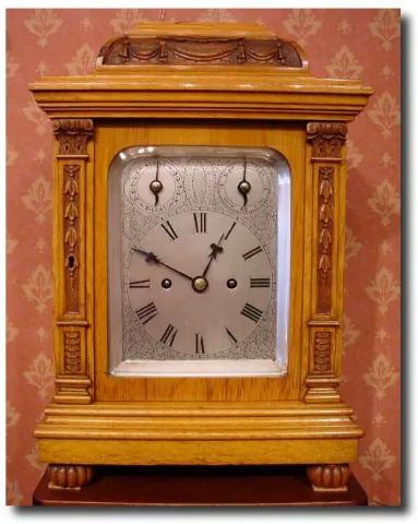 English honey-oak striking bracket clock, circa 1880 A fine quality small sized English honey-oak striking bracket clock, the honey-oak case with chamfer top with slight carving depicting baskets of flowers, pierced carved side sound frets with carved pillars to front door sitting on toupie feet, the 8-day English double chain fusee movement with maintaining power and anchor escapement chiming the hours and half hours on a gong with rise and fall regulation and strike/silent, the silvered and engraved dial with two subsidiaries and black Roman numerals. 15" x 10" x 7"