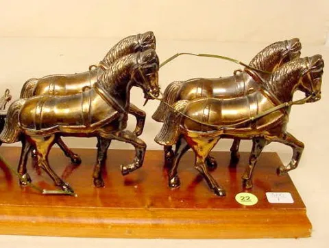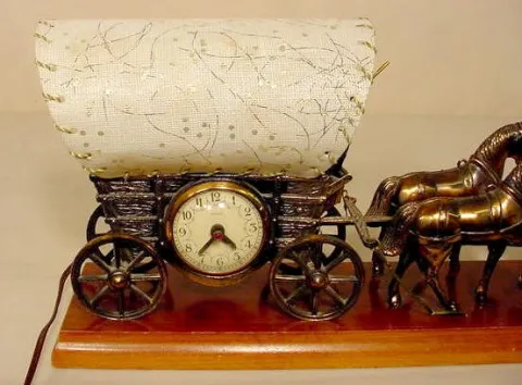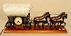metal covered wagon pulled by a team of horses; there is a switch for the driver to crack his whip; the light switches on and off. (Reins & harnesses...