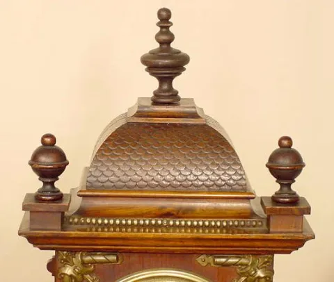 walnut & mixed woods; time & strike; brass accents; good dial. center finial has been replaced; no big problems.) Running at the time of listing, not ...