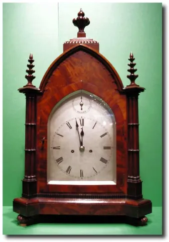 English mahogany cased silvered dial gothic bracket clock, circa 1839 An English fine quality flame mahogany cased early silvered dial gothic bracket clock. The finely carved mahogany case with very well figured mahogany. The 8- day 2- train gut fusee movement with hour and half hour strike on a large nickered bell signed and dated "D.Shaw", Leicester 1839. The Engraved silvered one piece dial with black roman numerals and strike /silent facility in the break-arch. Circa 1839. 28" x 18" x 10"