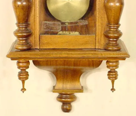 stained pine & mixed wood; rod strike. (Dial yellowed; minor split to upper door; finial replaced.) Running at the time of listing, not guaranteed to...