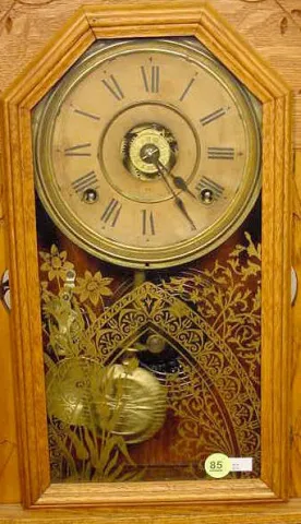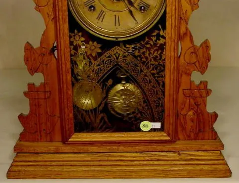 remains of label. (Old refinish, restoration to case; dial discolored.) Running at the time of listing, not guaranteed to continue. 22 1/2" T ...