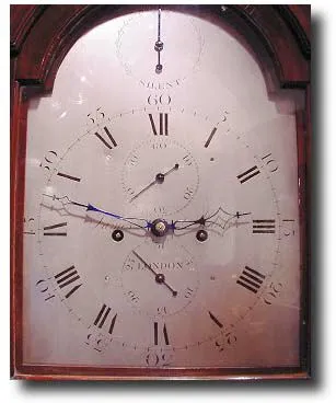 An impressive mahogany London longcase clock by "James Maule", London, the five pillar movement with a one piece silvered and engraved dial signed "James Maule", London with engraved seconds and date ring and strike/silent in the breakarch, the fine quality London made case with good original patination and nice colour with reeded columns to hood inset with brass stringing and unusual shaped original brass ball and spire finials,. 94" x 18" x 10" Additional keywords: longcase, tallcase, grandfather
