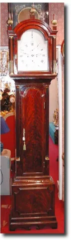 English mahogany longcase clock by "James Maule", London, circa 1770 An impressive mahogany London longcase clock by "James Maule", London, the five pillar movement with a one piece silvered and engraved dial signed "James Maule", London with engraved seconds and date ring and strike/silent in the breakarch, the fine quality London made case with good original patination and nice colour with reeded columns to hood inset with brass stringing and unusual shaped original brass ball and spire finials,. 94" x 18" x 10" Additional keywords: longcase, tallcase, grandfather