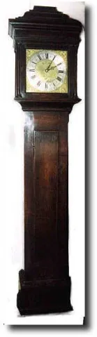 English Oak Cased Tallcase Clock, 18th century SAMUEL ASHTON, TIDESWELL. 30 Hour movement striking on a bell. Square brass dial with silvered chapter ring and date aperture by Samuel Ashton, Tideswell, Derbyshire, England. Plain oak case with caddy top to hood. Long slender trunk with long door typical of very early long case design. The movement cleaned and restoredand in full working order. Case restoration includes some work carried out by previous owner. Skirting to bottom of case has been replaced. Samuel Ashton is listed as working in Tideswell from 1723 to 1730. Height 120 inches. Additional keywords: longcase, tallcase, grandfather