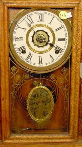 (Partially stripped case; recovered dial; discolored pendulum picture; natural wood split to top crown.) Running at the time of listing, not guarantee...