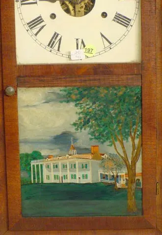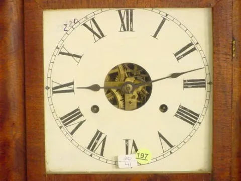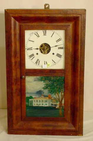 2 weight; mahogany veneer; nice interior label. (Dial & glass replaced; minor veneer losses.) Running at the time of listing, not guaranteed to contin...
