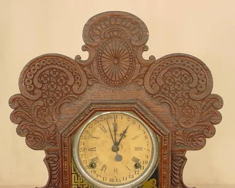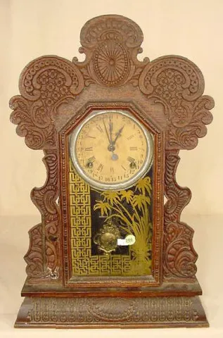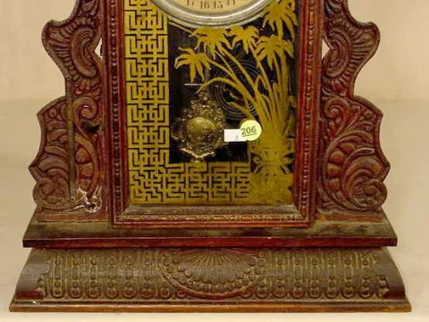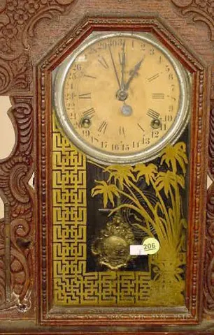 original finish oak pressed case; remains of paper label. (Dial wear; possibly old glass; barometer is gone; pendulum replaced.) Running at the time o...
