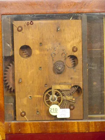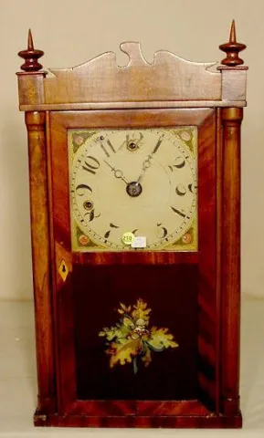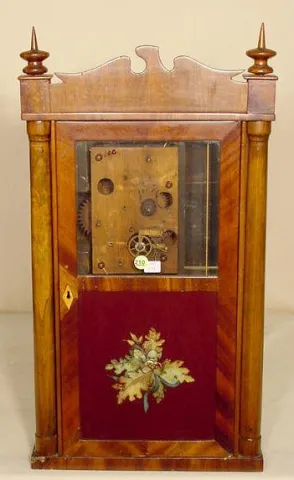 wooden works; remains of interior label; nice painted wooden dial. (Case refinished with some replacement parts; a little veneer loss; feet gone.) Not...