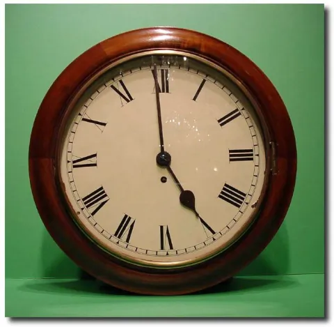 English single fusee painted 12" dial mahogany wall clock, Circa 1860 Early 8-day single fusee painted 12" dial mahogany wall clock. The white painted dial with black roman numerals and black spade hands. 17" x 16" x 6"