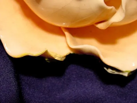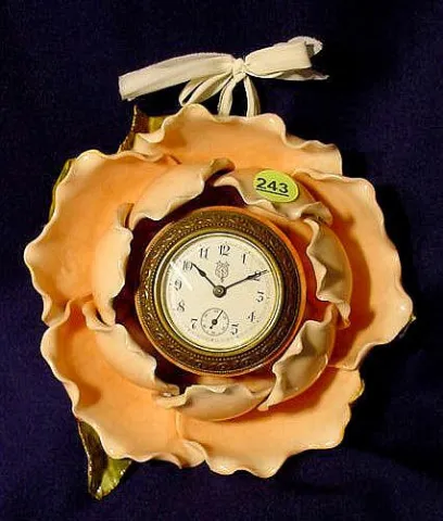 (Numerous breaks & losses to the leaves and flowers; porcelain dial damage.) Running at the time of listing, not guaranteed to continue. 11 1/2" T ...