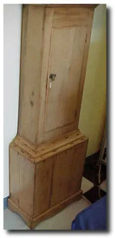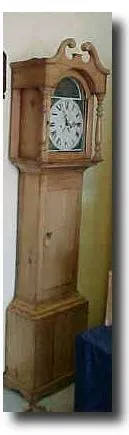 English stripped pine Tallcase clock, circa 1810 with broken arch top and turned columns. Has an unusual chinoisiere dial. Eight- day movement strikes the hour on a large bell. Has a calendar aperture and seconds bit. 7' tall. Additional keywords: longcase, tallcase, grandfather