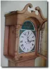 with broken arch top and turned columns. Has an unusual chinoisiere dial. Eight- day movement strikes the hour on a large bell. Has a calendar aperture and seconds bit. 7' tall. Additional keywords: longcase, tallcase, grandfather