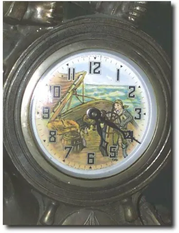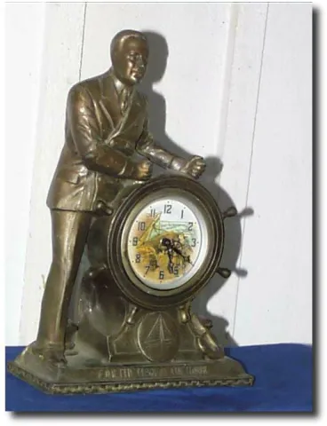 "FDR The Man Of The Hour" "Animated Dial", circa 1933 The boy at the helm moves his arm and the wheel at every tick. Case: White metal with original bronze finish 15" tall Works: 30 Hour lever escapement key wind spring driven works. Maker, dial marked, " United Electric Clock Corp, Brooklyn, NY." Condition: Case - excellent; Works: Excellent .