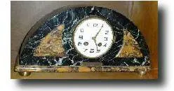 French Art Deco Marble, c. 1910 Comment: High quality French works. Stock Number:134-1079 Case: Marble half round case, 15.5" wide Works: French brass 8 day movement with striking on bell Condition: Case - excellent , Works, excellent. Additional keywords: mantel, mantle, shelf