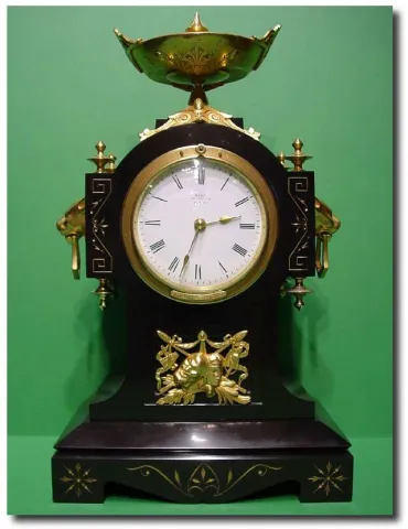 Unusual exhibition quality French black marble and ormolu mounted mantel clock. Front winding movement patented by "R. Houndins" patent winding with external slow fast adjuster. External hand adjuster and external regulator adjuster. Retailed by "Dent", 61 Strand London. Circa 1880. 16" x 9" x 5.5"