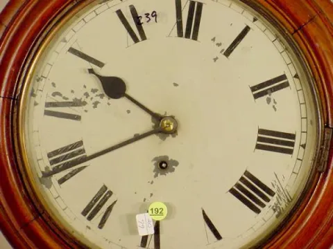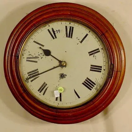 enameled dial marked Terry Clock Co. with Roman chapter ring, outer minute ring marked with ticks, triangles and diamonds every 5 minutes, brass 8-da...