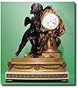 French bronze cherub mantle clock, circa 1870 A extremely large sized French bronze cherub mantle clock, the case with white carrera marble and gilt ormolu mounts supporting a large bronze cherub with a golden sash to his waist all sitting on toupe feet, the 8-day signed and numbered French movement with hour and half hour strike on a bell stamped by the maker with a ship at sea, the white enamel convex dial with black Roman numerals signed "Bourdier Hr",Paris, finely pierced gilt hands 24" x 18" x 10"
