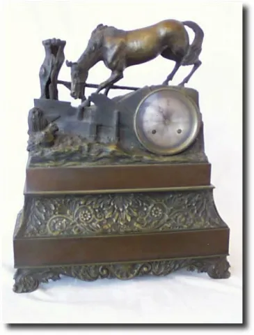 French Bronze Figural Clock, c. 1860's Case: Bronze 16" tall, 12.5" wide and 5" deep Works: French 8 day time with strike on bell. Condition: Case: excellent, There is a very small mounting hole in the river for something that is not there.; Works: excellent, They will be clean and running. Additional keywords: mantel, mantle, shelf