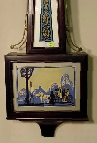 with Tablet, painted and gilt wooden dial with Roman on chapter ring, outer minute ring marked with ticks, bold every 5 minutes, floral in spandrels ...