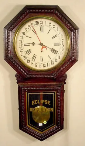 attributed to Seth Thomas, with painted dial with Roman on chapter ring and raised gilt minute dots on inner ring, stylized floral rosettes at spandr...