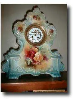 Porcelain case, eight day brass movement, porcelain dial; 17 1/2" tall by 16" wide. Condition: Overall excellent. There is a small "shim" epoxied onto the underside of the rear of the base to even the stance of the clock. This is invisible unless the clock is picked up and turned over. So, we list the clock as EXCELLENT. Additional Dealer Comments: This larger-than-usual porcelain mantle clock has been carefully gone over in our clock shop by a Master Clockmaker to assure perfect running condition. The case is free from cracks, chips and crazing.