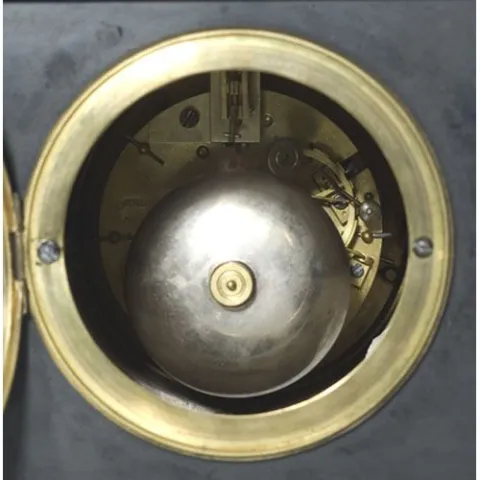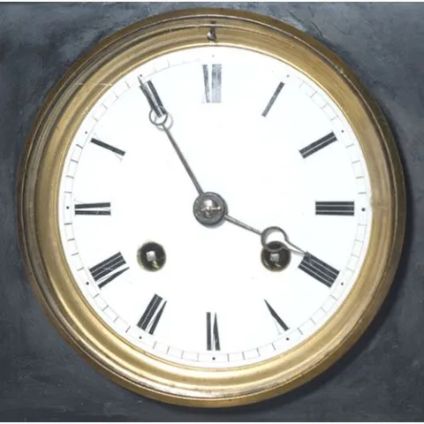 bronze and slate with enameled dial having radial Roman numerals on chapter ring and minute ticks in outer ring with dots for each ten minute mark, w...