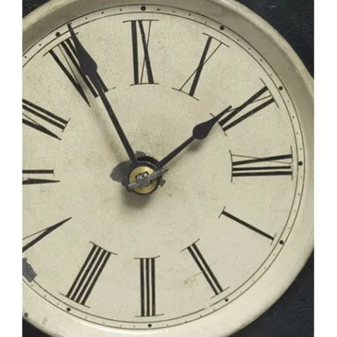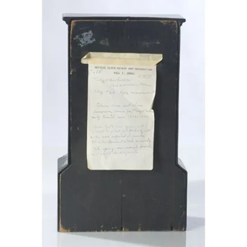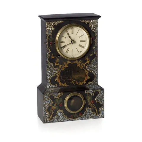 Ct. Pearl Inlaid Iron Shelf Clock, ca 1840's with original painted tin dial with radial Roman numerals on chapter ring with minute ticks in outer rin...