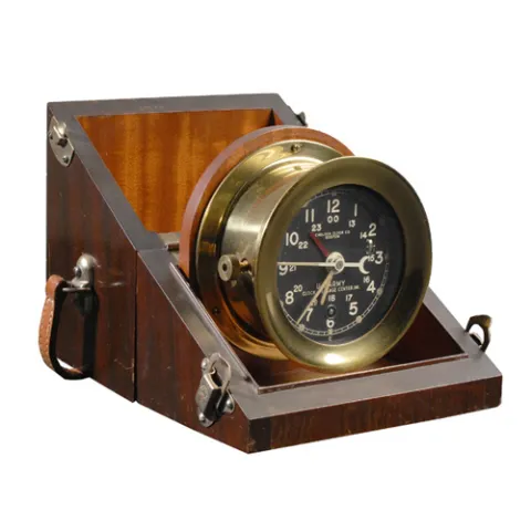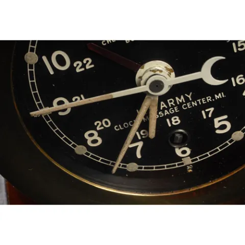 circa 1950. A clock with features of the M1 and M2 Message Center clocks made by Chelsea for the U.S. Army, in original mahogany finished wooden carr...