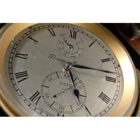 ca 1950, a two-day (56-hour) marine chronometer by Thomas Mercer, Ltd. London. Cast brass bowl with threaded glazed bezel gimbaled in two-body mahoga...