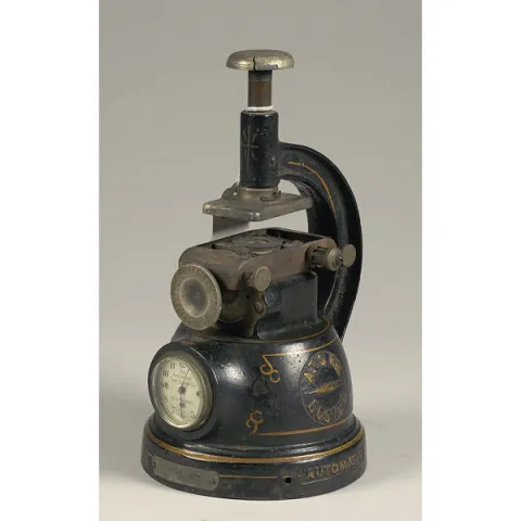 time punch-type housed in a cast iron frame embossed A.S.T. Co. Boston Automatic in original black paint with gold scrollwork, keywind spring-driven ...