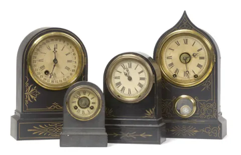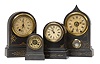 all with printed paper labels on wooden backs and Roman numerals on printed paper over tin dials. The largest has calendar in Arabic at chapter ring,...